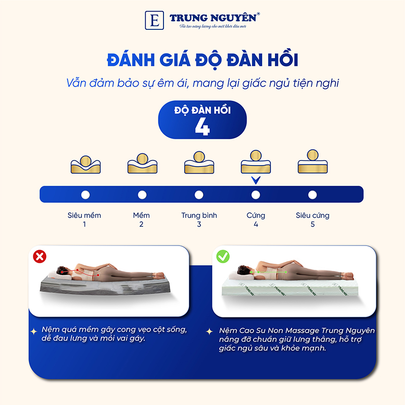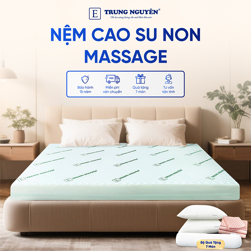 Nệm cao su non Massage Trung Nguyên được làm từ chất liệu cao su có cấu tạo độc đáo giúp sản phẩm có độ đàn hồi tốt, phù hợp với cấu trúc cột sống của mọi lứa tuổi. Ngoài ra, hiết kế bề mặt của nệm đặc biệt với hàng nghìn núm nhọn cùng với những lỗi thoáng hơi nhỏ ở phía trên và hàng trăm lỗ thoáng hơi lớn ở phía dưới, mang đến cảm giác êm dịu, nhẹ nhàng và mát mẻ, thông thoáng khí cho người nằm, đem lại một giấc ngủ ngon, thoải mái sau một ngày học tập, làm việc căng thẳng.