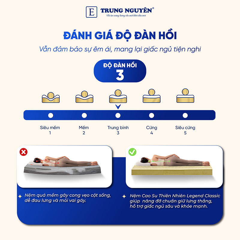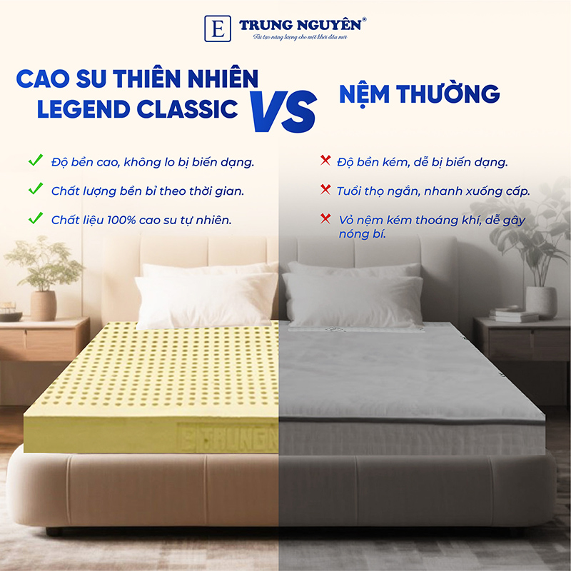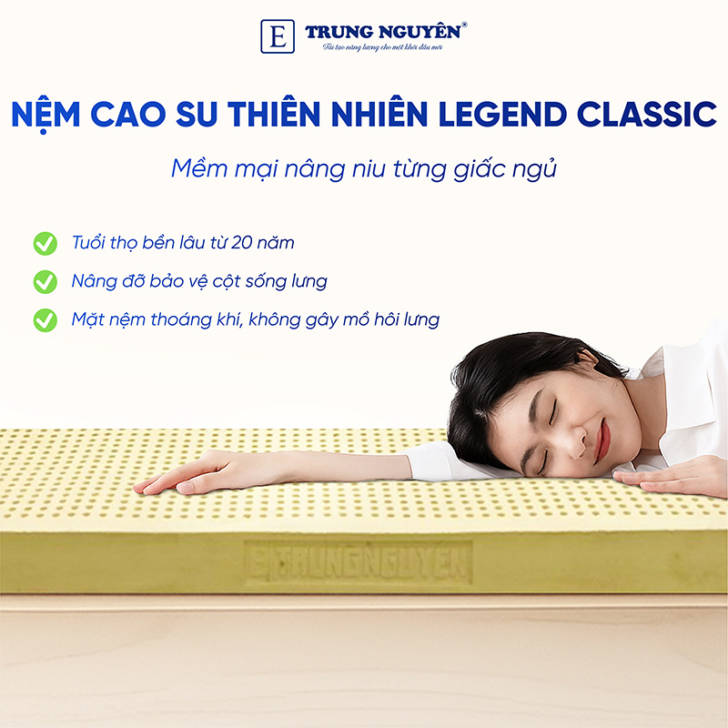Nệm cao su thiên nhiên Trung Nguyên Legend Classic là dòng nệm cao su tinh khiết 100% thiên nhiên có độ đàn hồi cao, giúp nâng đỡ cơ thể trong mọi tư thế nằm, đem lại giấc ngủ ngon trọn vẹn.