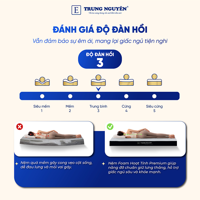 Nệm Foam hoạt tính Premium Trung Nguyên là một trong những loại nệm được nhiều khách hàng tin tưởng sử dụng với chất lượng tốt và giá cả phù hợp. Nệm có độ mềm mịn, êm ái giúp nâng đỡ cơ thể theo từng đường cong. Nếu bạn muốn có giấc ngủ ngon và tốt cho sức khỏe hãy chọn ngay sản phẩm nệm Foam này.