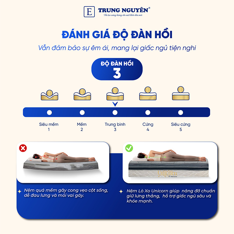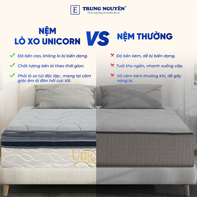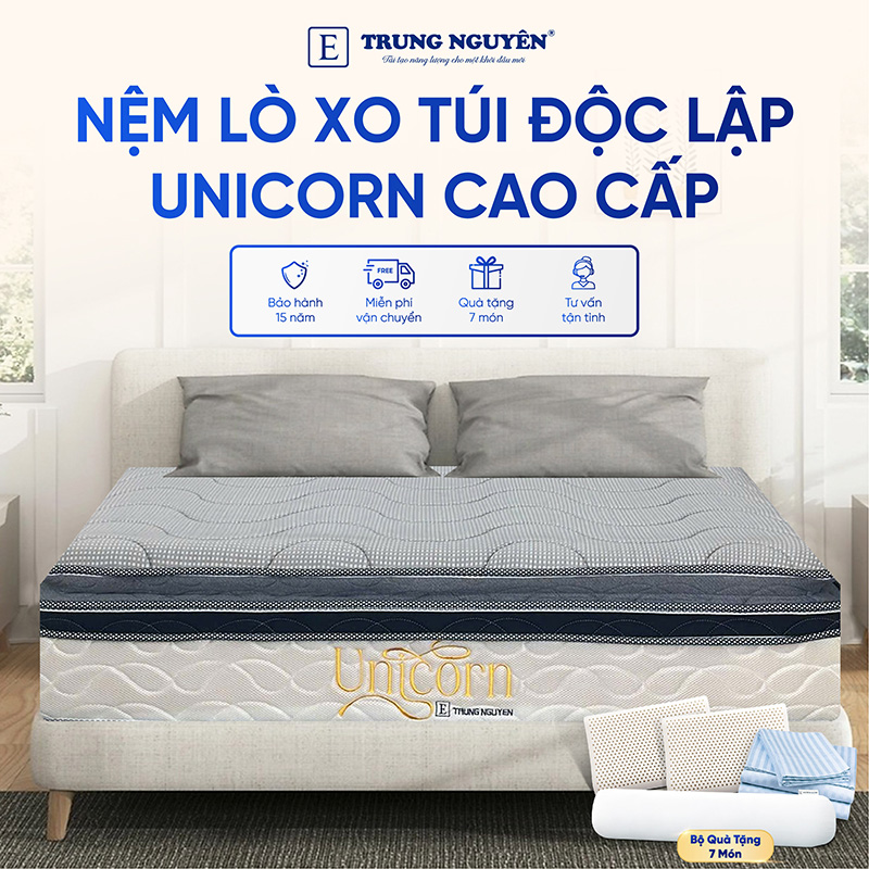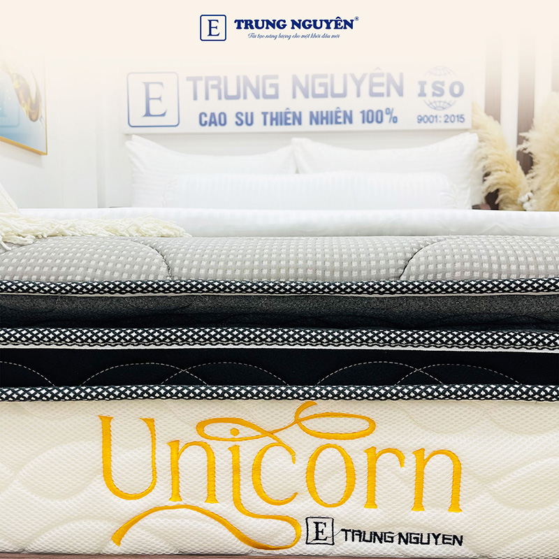 Cấu trúc nệm lò xo túi Độc Lập Unicorn Trung Nguyên nâng đỡ và xoa dịu cơ thể một cách tối ưu. Từng cuộn lò xo được uốn kỹ càng từ thép cao cấp nhập khẩu, được kiểm định khắt khe trước khi đưa vào túi bọc, tạo nên lớp lò xo đế đàn hồi cao và êm ái.